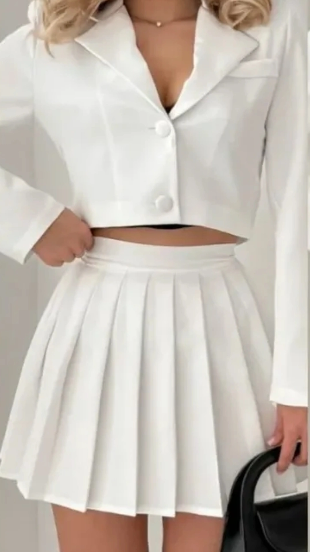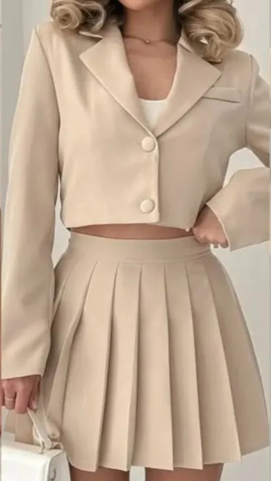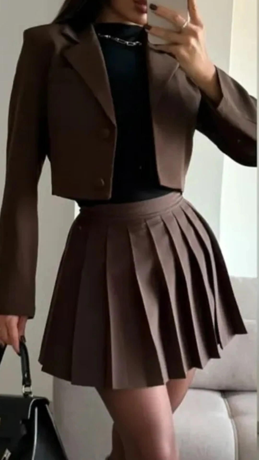ایستایی عالی دامن پلیسه کت کراپ جذاب برای استایلهای ترندی مناسب ۴ فصل ترکیبپذیر با بوت، نیمبوت، کیف دستی و زیورآلات مینیمال مناسب قدهای مختلف (بهدلیل فرم A دامن)