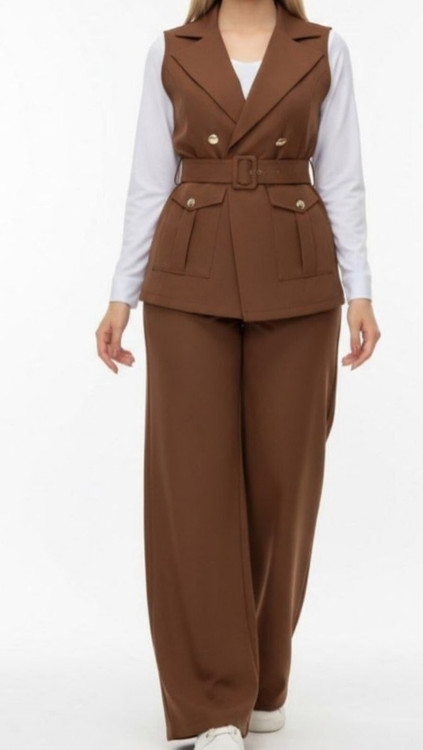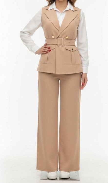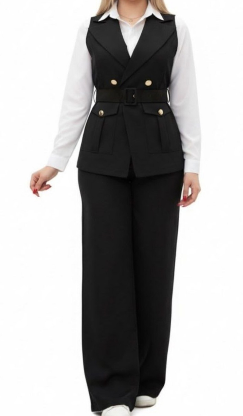 ست سهتیکه زنانه Clesta، ترکیبی از ظرافت و استایل مدرن است. این ست شامل شلوار راحت و گشاد، جلیقه کمردار با دکمههای طلایی و پیراهن ساده زیر آن است. طراحی مینیمال و برش دقیق، فرم بدن را زیبا نشان میدهد و مناسب محیطهای رسمی و کژوال لوکس است.