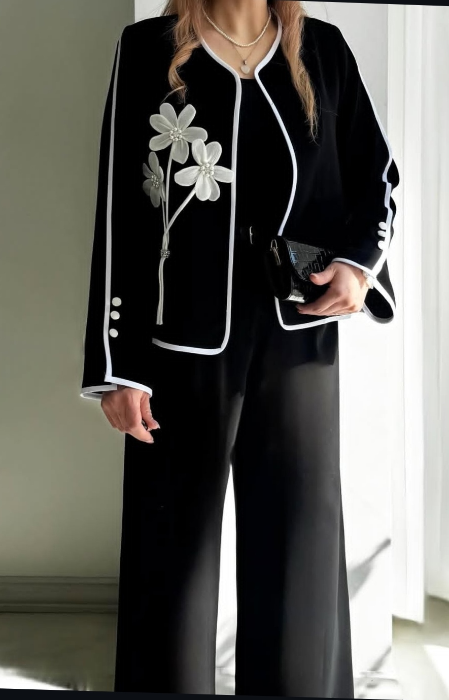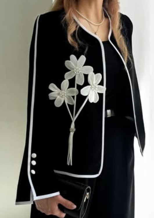 این کت با تلفیق رنگ مشکی عمیق و جزئیات سفید ظریف، نمونهای از یک طراحی مینیمال اما چشمگیر است. گلهای برجستهی دستدوز، بدون ایجاد شلوغی بصری، جلوهای زنانه و هنری به لباس بخشیدهاند و آن را از یک کت ساده به یک آیتم خاص تبدیل کردهاند.